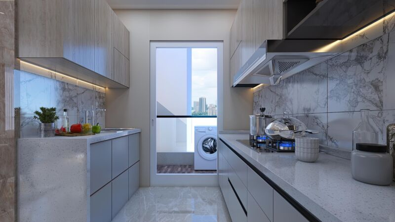 The kitchen is modern and functional, fitted with high-quality fittings and fixtures, making cooking a delightful experience. The living and dining areas are spacious, creating a perfect setting for family gatherings and entertaining guests.